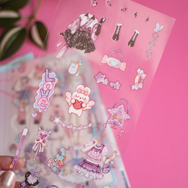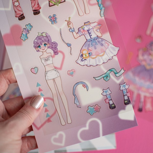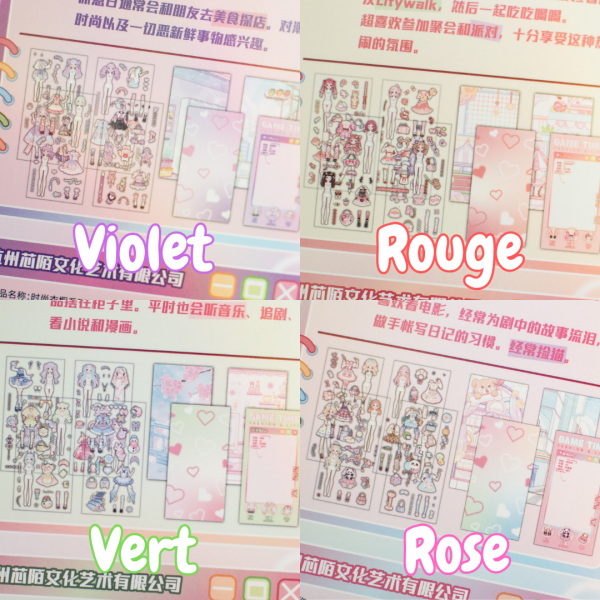 Chaque set contient 4 planches "décor" et 4 planches de stickers avec les tenues et tous les acessoires.