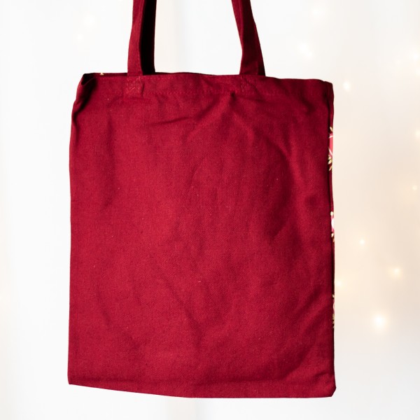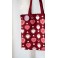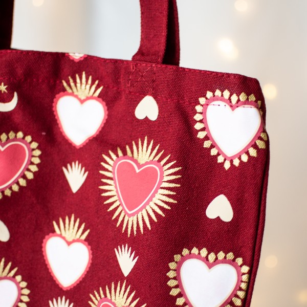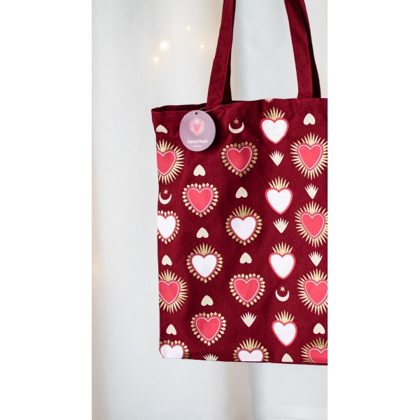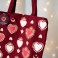 Un tote bag rouge profond aux jolis motifs coeurs, au style affirmé et romantique.